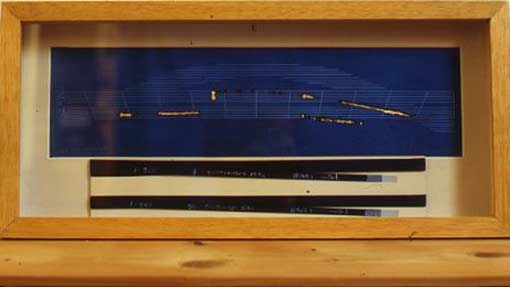 The photograph of musical staves shows this process, with the lens at the top right corner. Each of these burn prints involves chance; no print can ever be repeated exactly. Some of the prints are scanned into audio software to create random sound pieces, others as a metaphor for change and unpredictability.