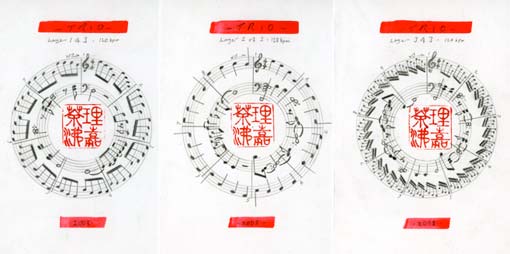 The photograph of musical staves shows this process, with the lens at the top right corner. Each of these burn prints involves chance; no print can ever be repeated exactly. Some of the prints are scanned into audio software to create random sound pieces, others as a metaphor for change and unpredictability.