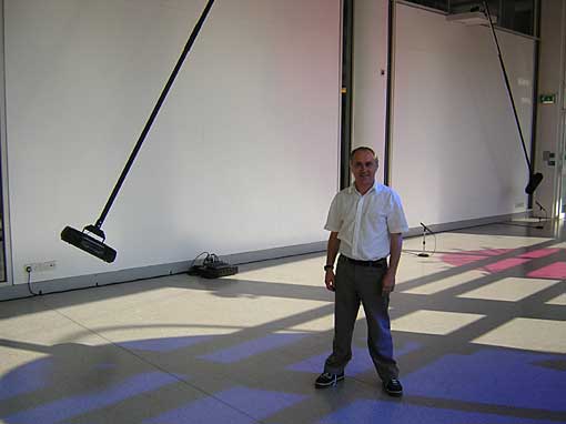 WAVE-WALL III features three giant pendulums, reaching from floor to ceiling, each of which have radio-cassette players as weights. Images overlaid onto the wall and windows of the gallery act as graphic representations of the specially-composed music being played continually through each cassette player, turning the gallery into a 'sound-chamber'. This music, which rises and falls in a similar fashion to the continuous motion of the pendulums, was derived from sound-samples of a variety of natural and man-made waveforms recorded and reprocessed by Hooker. The continuous audio cycle that the work generates commences with 'live'…